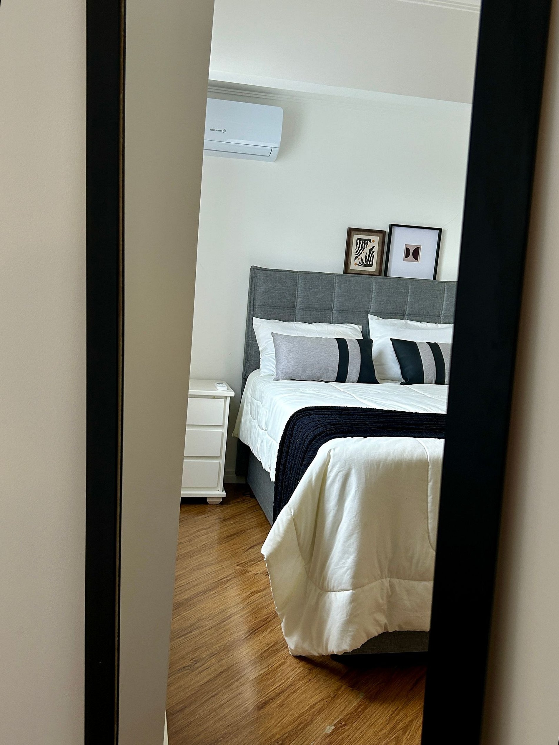 O imóvel conta com 2 dormitórios (sendo 1 suíte), sacada com churrasqueira a carvão, cozinha equipada, ar-condicionado e 2 vagas de garagem privativas.